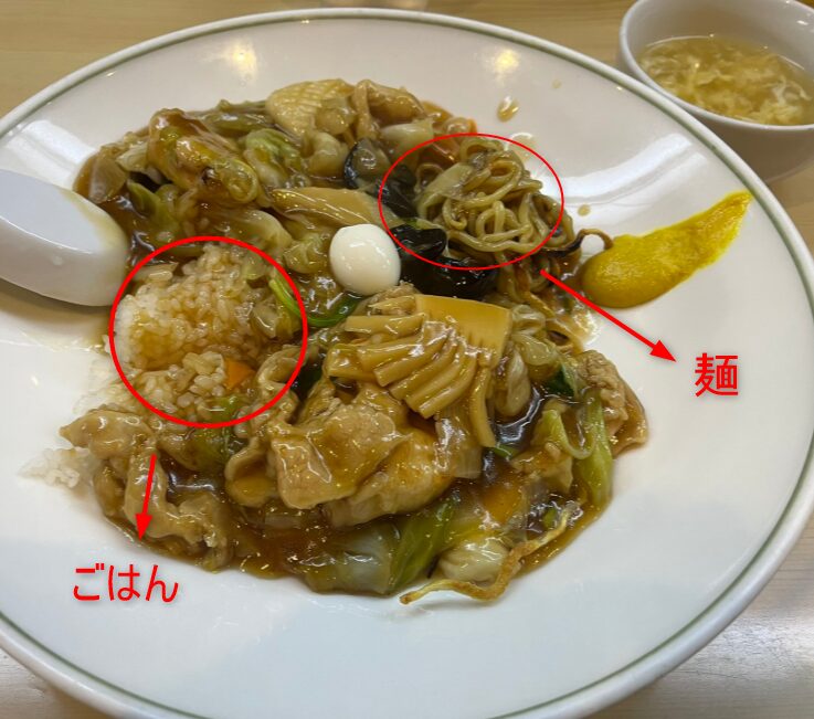 実は、中華あんの下にはご飯と麺が隠れている一品。