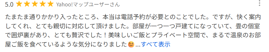 hotpepperなどの口コミでは、「雰囲気」、「料理」、「接客サービス」のすべてで高い評価を得ています。