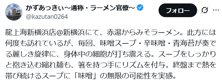 実際に「龍上海」の”赤湯からみそラーメン”を食べた人からは